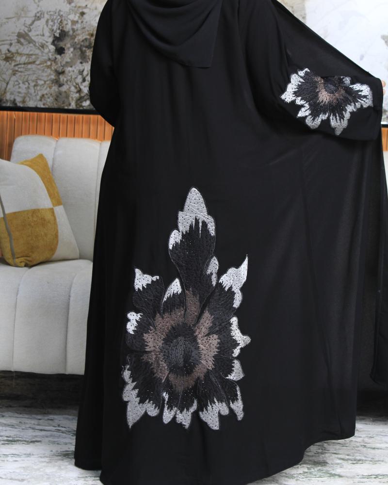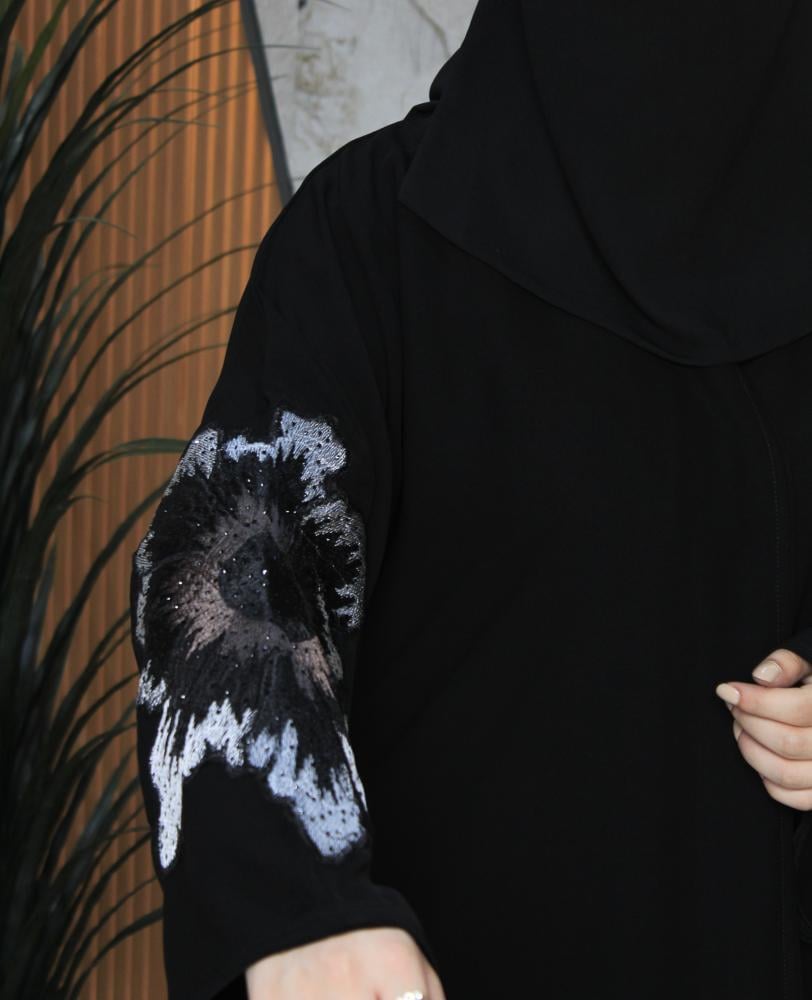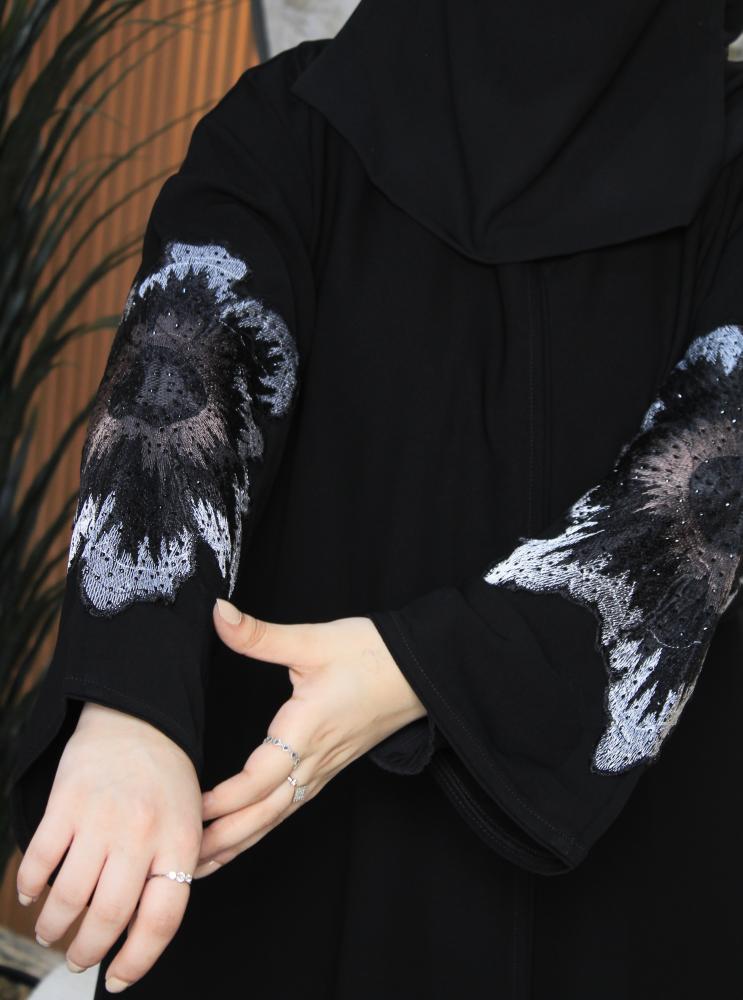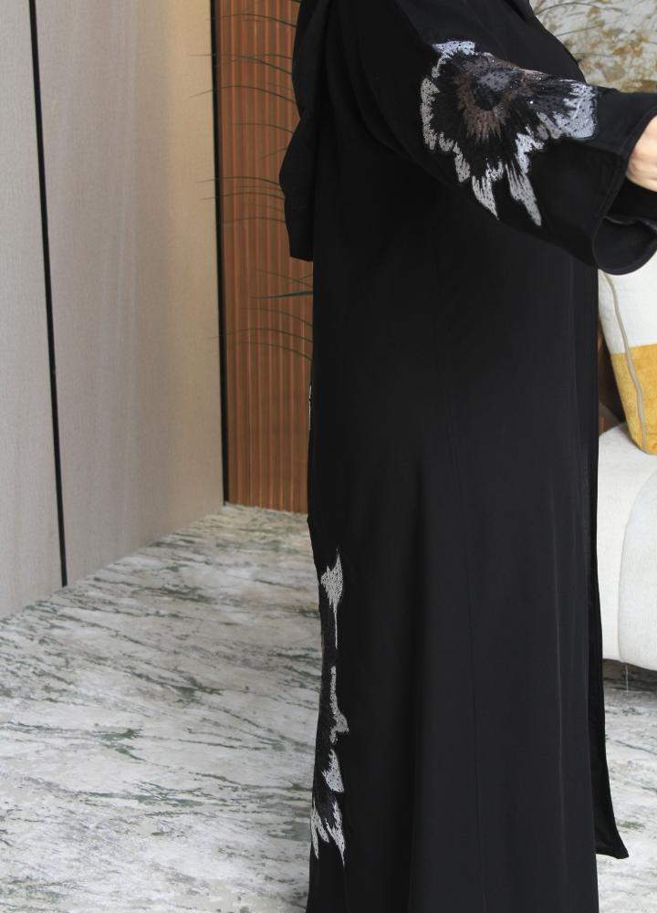 إليكِ عباية ايلين المصنوعة من أجود أنواع الكريب الملكي الفاخر، بقصة أنيقة وأكمام مطرزة بكريستالات لامعة تمنحك حضورًا متألقًا في كل مناسبة.