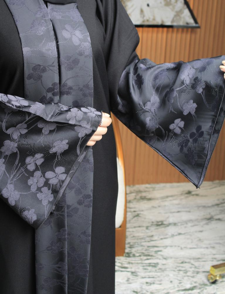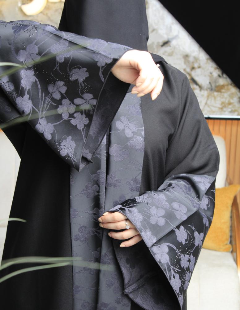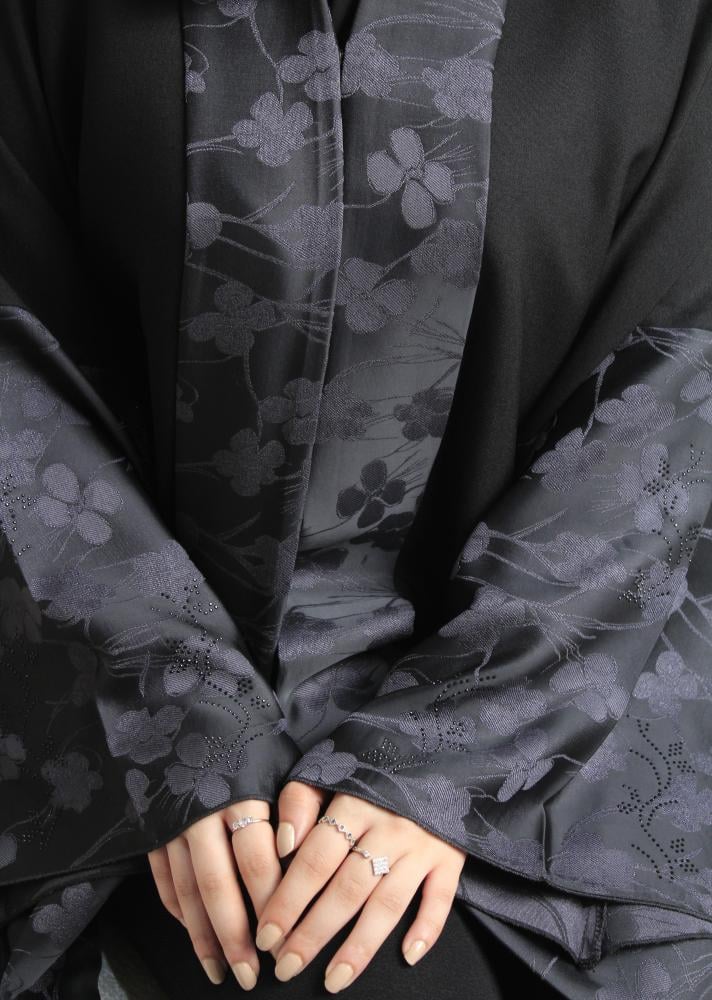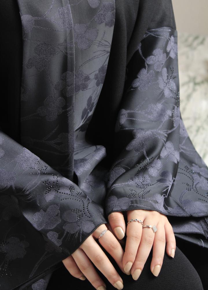 إليكِ عباية سيلين المصنوعة من أجود أنواع اقمشة اللمار الواقف بقصة أنيقة وأكمام مطرزة بكريستالات لامعة تمنحك حضورًا متألقًا في كل مناسبة.