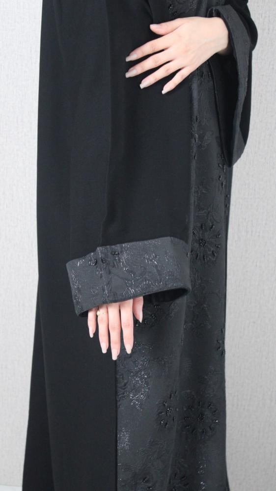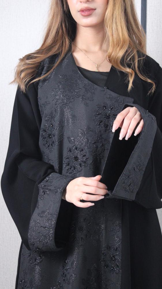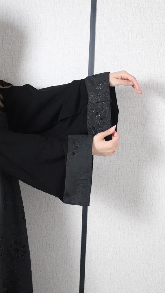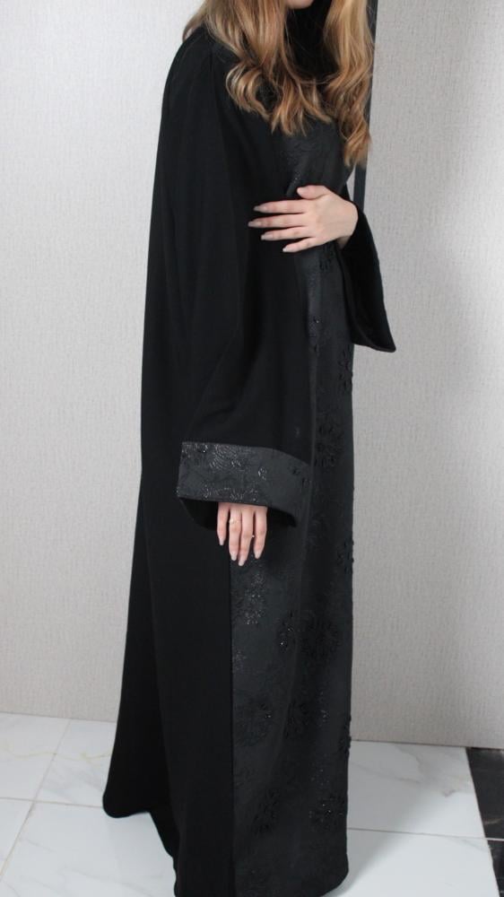 التصميم: عباية مطرزة ورد أنثوية بدقة عالية على الأكمام والصدر
