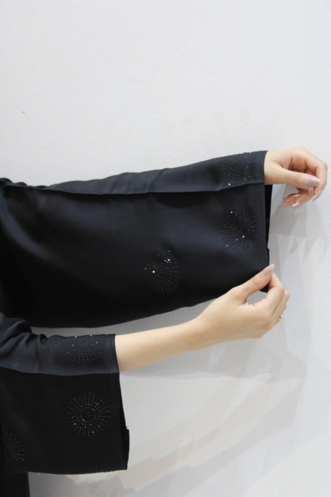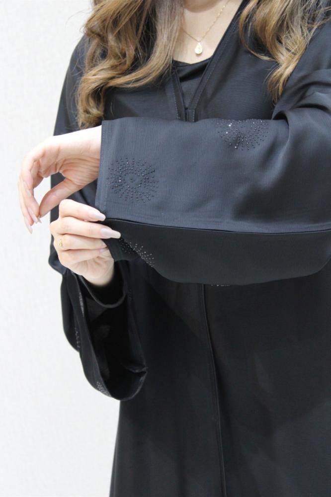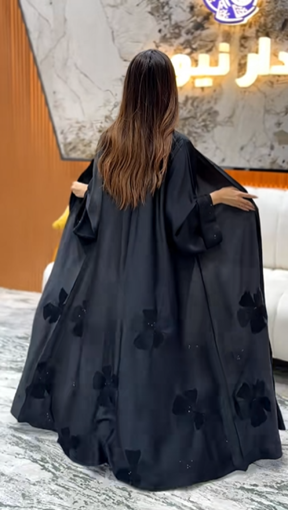 اللمسة النهائية: حواف العباءة مزخرفة بشكل أنيق، مما يضيف مزيدًا من الجاذبية.