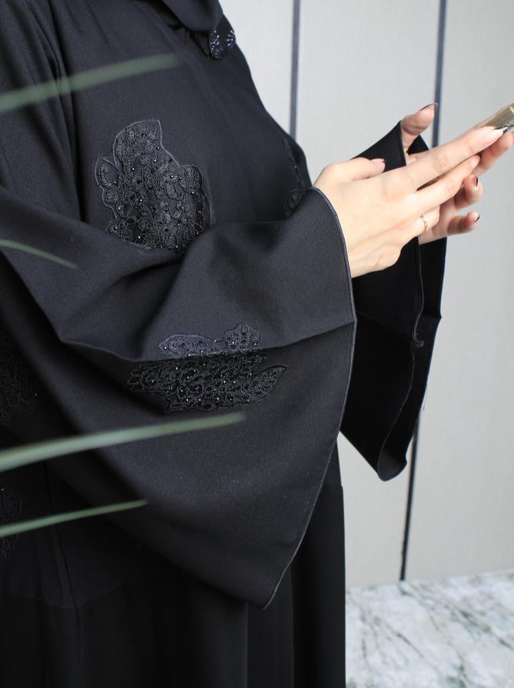 إليكِ عباية نوشا المصنوعة من أجود أنواع قماش الكريب الملكي مع ندخيله لمار من الاعلى الناعم بقصة أنيقة وأكمام مطرزة بكريستالات لامعة تمنحك حضورًا متألقًا في كل مناسبة.